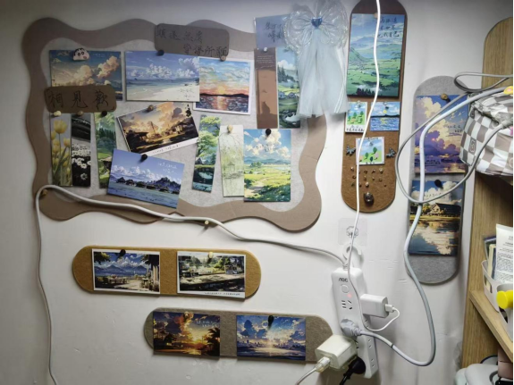 在此次设计大赛中部分寝室中融入了传统国风元素,以毛笔书法卷轴搭配浪漫挂饰挂饰装饰门窗,让雅致的文化气息与生活空间相融合,既打破了常规寝室的单调感,也传递出对传统文化的喜爱与审美,营造出独特的文化氛围。