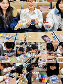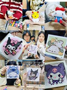 纯白石膏猫、星星灯、小怪兽依次排开,同学们提笔调色,星空、渐变、涂鸦风格轮番登场;一侧的拼豆区“哒哒”作响,钥匙扣、杯垫、像素花在镊子下成型。