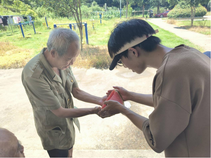 吃完饺子,实践团成员又给每一位老人都送上了西瓜,欢声笑语充满了整个房间,让老人们感受到了来自同学们的关爱与温暖。“今天好开心,不仅帮助我们搞了卫生,还吃到了饺子和西瓜,更让我们多了一些幸福。”78岁的李大爷笑着说道。