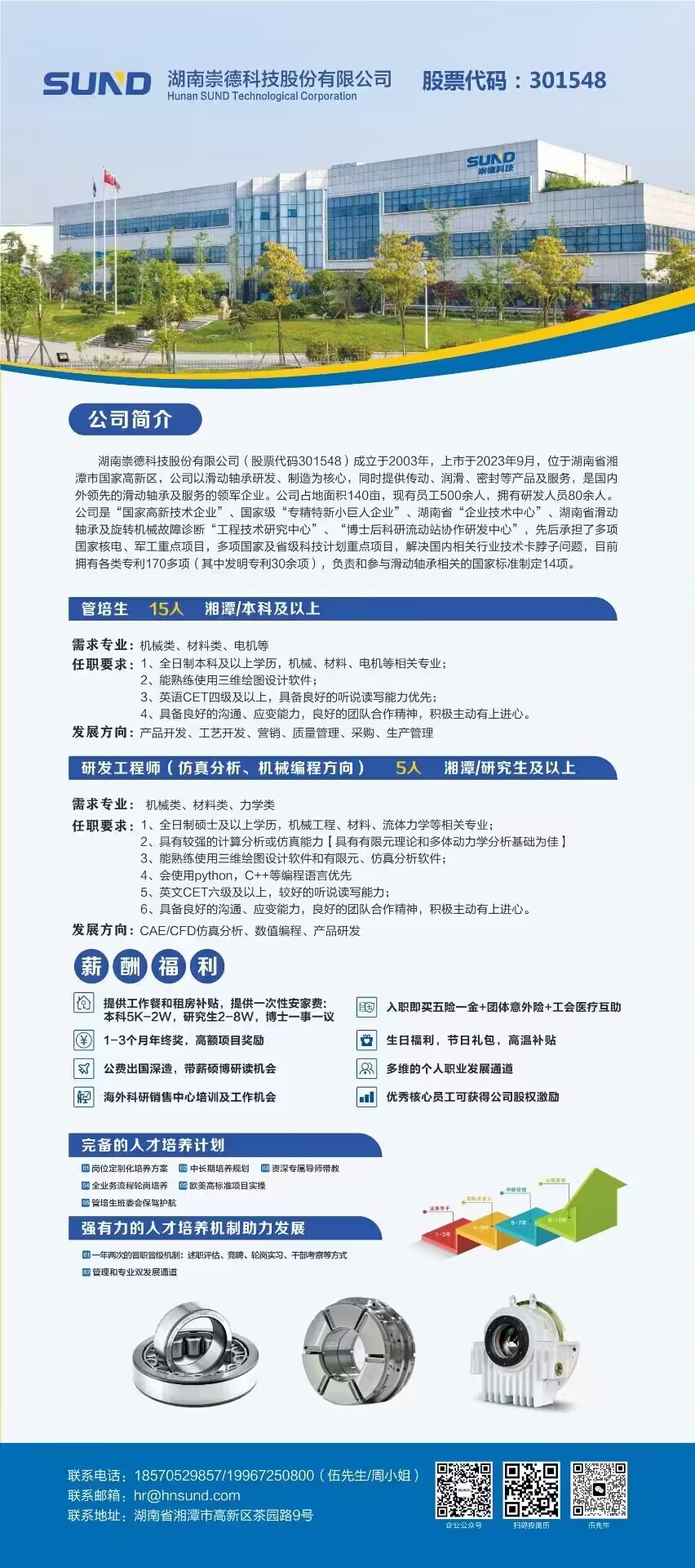 湖南崇德科技股份有限公司(上市公司)校招聘会即将开始! 时间:2023-10-11 14:00 地点:机械楼411教室 本次2024届校招需求20余人,涵盖机械类,材料类、力学类等 凡到场签到即可获得精美礼品一份/饮品 薪资:本科 8-10万/年,硕士 10.5-13万/年,博士面议 福利:一次性安家费、年终奖、项目奖金、部门奖金、七险一金、生日福利、高温补贴、工作餐、租房补贴、其他各类津补贴等投递简历邮箱:hr@hnsund.com联系电话:伍先生19967250800/周小姐13875215797工作地点:湖南湘潭或湖南长沙