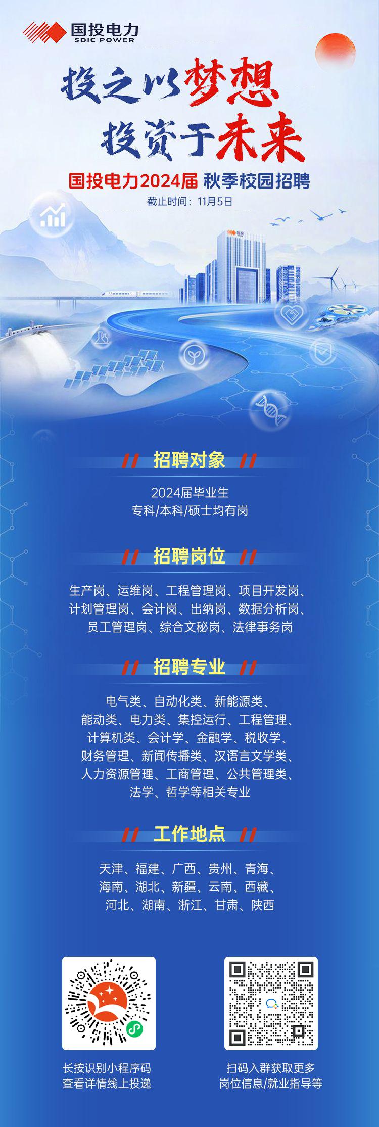 国投电力控股股份有限公司2024届秋季校园招聘截止时间:2023年11月5日学历要求:专科/本科/硕士均有岗招聘岗位:生产岗、运维岗、工程管理岗、项目开发岗、计划管理岗、会计岗、出纳岗、数据分析岗、员工管理岗、综合文秘岗、法律事务岗招聘专业:电气类、自动化类、新能源类、能动类、电力类、集控运行、工程管理、计算机类、会计学、金融学、税收学、财务管理、新闻传播类、汉语言文学类、人力资源管理、工商管理、公共管理类、法学、哲学等相关专业工作地点:天津、福建、广西、贵州、青海、海南、湖北、新疆、云南、西藏、河北、湖南、浙江、甘肃、陕西