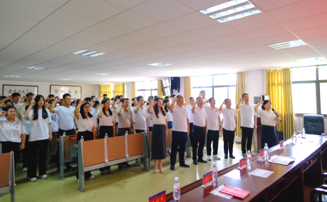 学院党委委员为2025年上半年新发展党员佩戴党员徽章。新党员进行入党宣誓,老党员重温入党誓词,促进新老党员同心,将忠诚与认同深植信仰之根。