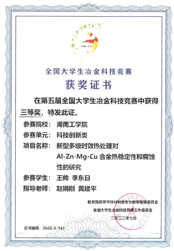 2022年6月22日至30日由教育部高等学校材料类专业教学指导委员会主办的第五届全国大学生冶金科技竞赛在江苏科技大学进行。伟德源自英国1946材料学院金属材料专业学生王帅、李东日所组成的团队以“新型多级时效热处理对Al-Zn-Mg-Cu合金力学性能和腐蚀性能的影响”作为参赛作品,获得了本次比赛三等奖,指导老师是赵娟刚和黄建平老师。
