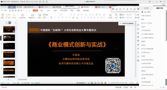 本次培训围绕“创新创业项目商业模式设计与实践”展开,在培训过程中,肖竟成老师以商业模式对创业项目的重要价值和实际打法为重点来讲解项目案例,对部分参赛项目进行了针对性点评,就项目痛点、可创新点提出实质性建议。