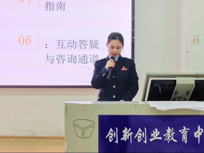 随后,珠晖区税务局一级行政执法员丁莹围绕创业税收基础知识、国家层面税收优惠、本地扶持政策、办税实操及常见风险防范等内容进行了系统讲解,并通过案例提问的方式,与学生积极互动,帮助大家把握政策要点。