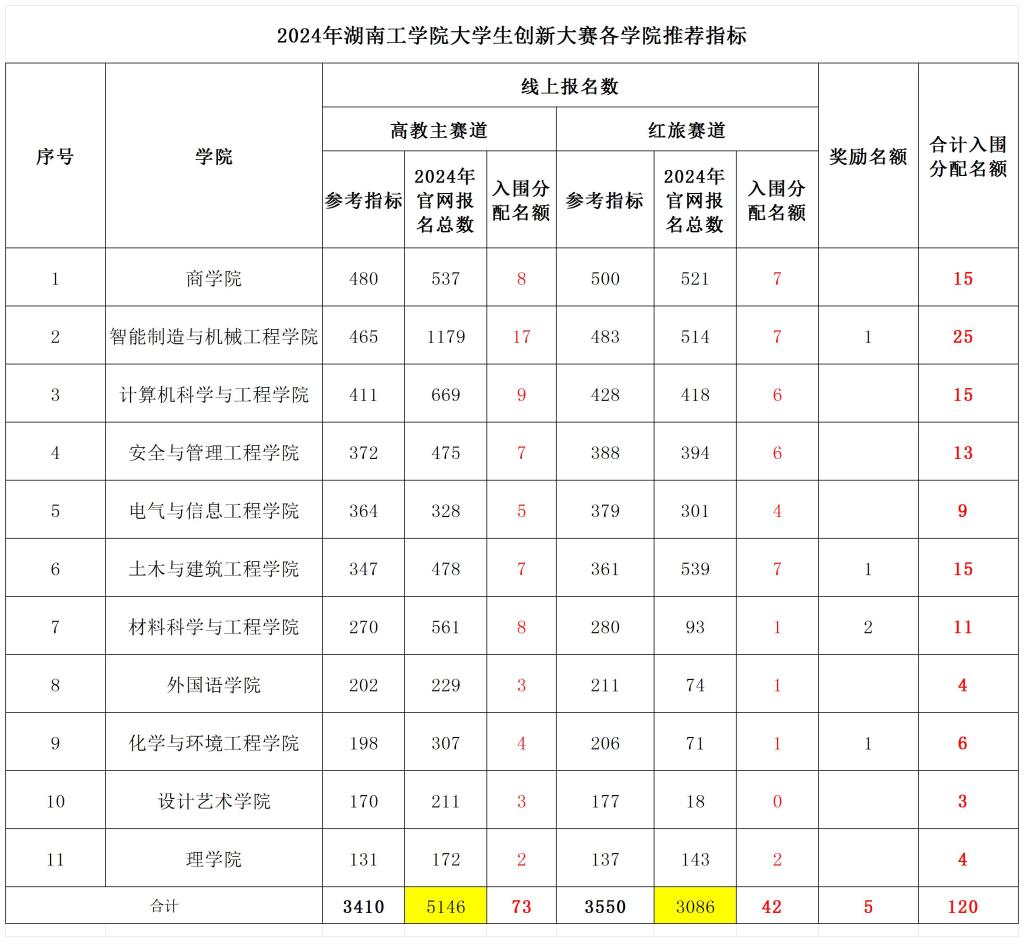 各赛道推荐指标按已发布的各赛道奖励数计算比例,各二级学院根据院赛结果排序按比例推荐。各赛道推荐比例计算方式分别为: