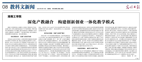 2024年8月,《光明日报》专题报道学校“深化产教融合 构建创新创业一体化教学模式”的经验做法,将改革成果推向全国视野。
