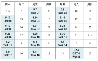 3、任务时间:5月7日起每周一、三、五 7:00自动发布1个任务,所有任务的截止时间均为6月14日0点。