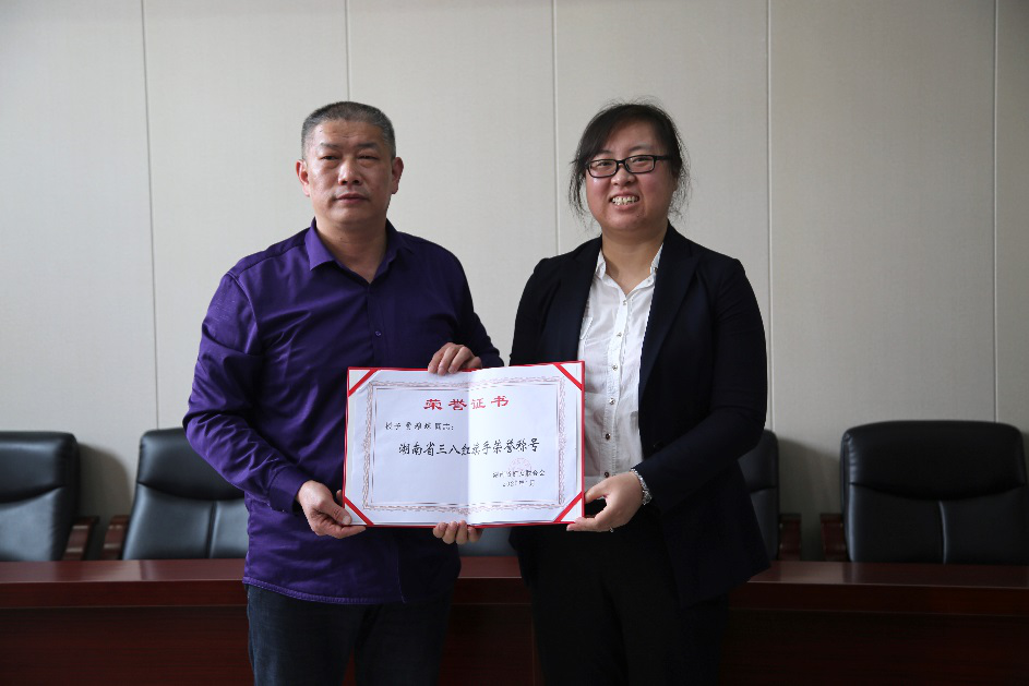 4月8日上午,湖南省妇联宣传部调研员刘伟东专程上门送奖,为我院荣获“湖南省三八红旗手”的贾雅琼老师隆重颁奖。颁奖仪式在教学大楼12楼小会议室举行,校领导张平、曹执令、罗蔚、袁勤以及党政办、工会、学院主要负责人出席授奖仪式。