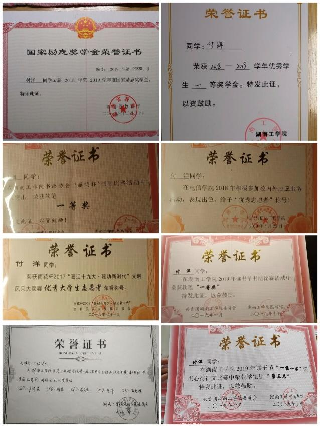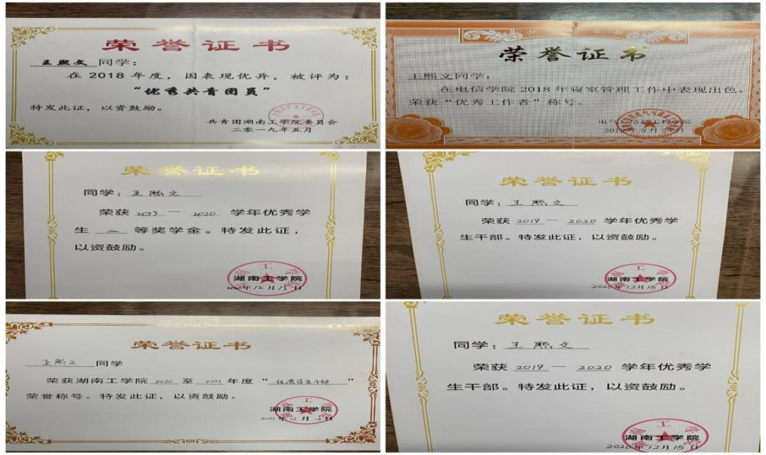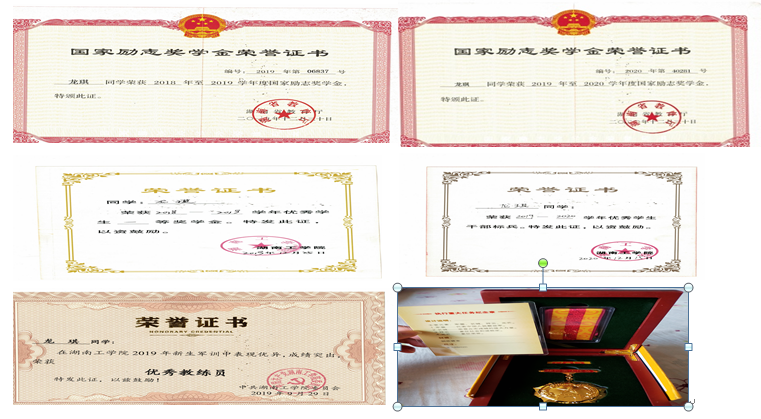 在校期间获得国家奖学金1次、国家励志奖学金2次、校一等奖学金3次、校优秀共青团干1次、校优秀共青团员2次、校优秀干部1次。此外,荣获湖南省挑战杯竞赛三等奖、校互联网+创新创业大赛一等奖、校电子商务大赛二等奖、校圆融杯电子设计大赛二等奖、院主持人大赛一等奖、院职业生涯规划大赛一等奖、院爱国主题征文比赛一等奖等奖项。通过自学获得大学英语六级、国家计算机二级等证书。