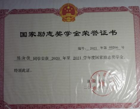 在校期间连续三年学习成绩和综测均为班级第一,荣获国家奖学金1次、国家励志奖学金2次、校级一等奖学金3次、三好学生2次、优秀学生干部1次、优秀共青团员干部1次,优秀共青团员1次。