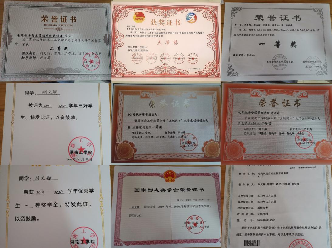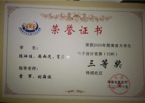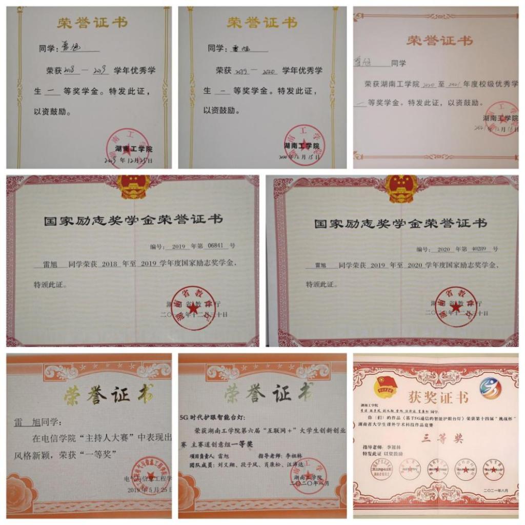 在校期间获国家励志奖学金、二等奖学金、三等奖学金、校优秀工作者、优秀学生干部;2020年国家级大学生创新创业项目负责人。曾积极参与并协助学院创新创业类比赛、电子竞赛等赛事,荣获2020年湖南省大学生电子竞赛三等奖;2021年全国大学生电子竞赛一等奖;校级“圆融杯”、“互联网+”竞赛等奖项;参加“三下乡”大学生社会实践活动。