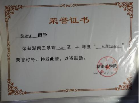 在校期间获2018届新生才艺大赛三等奖;2020年元旦晚会优秀演员;2018-2019、2020-2021学年校三等奖学金;2019-2020学年校二等奖学金;2019-2021学年优秀学生干部;2018年度优秀共青团团员;“优秀工作者”、“优秀参与者”称号;所在宿舍多次被评为“文明宿舍”,通过英语四级、国家计算机二级。