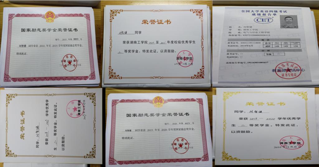 在校期间荣获一次学习成绩和综测均为班级第一,获国家励志奖学金、一等奖学金,二等奖学金、三等奖学金、优秀共青团员,优秀学生干部。