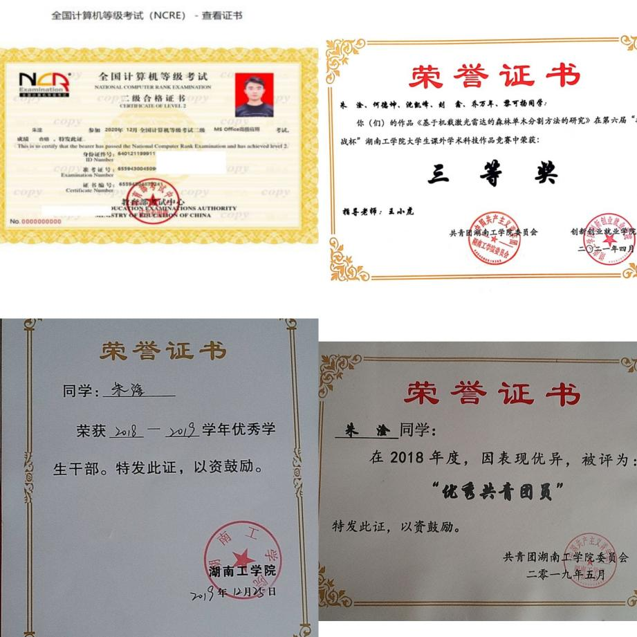 在校期间获得校级一等奖学金3次、校三好生2次、优秀团员1次、电信新生才艺大赛二等奖、研究性学习竞赛校三等奖。