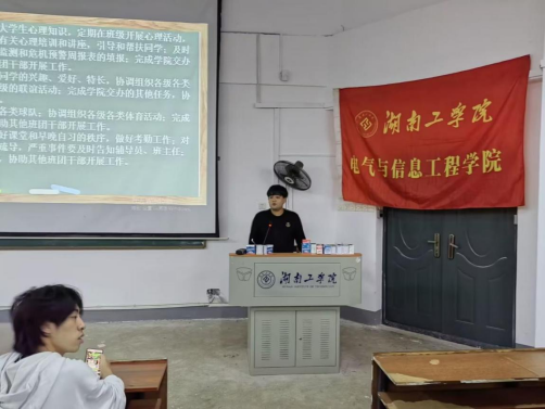 首先由院团委学生会轮值主席刘硕发言,他强调了班级建设对于学风的重要性,并指出各大班委在班级中的作用。以及学生干部应培养大局观,服从与反馈,倾听这三种意识与工作能力。