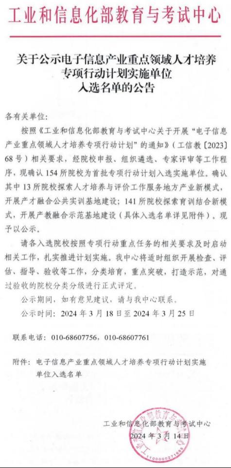 近日,国家工业和信息化部教育与考试中心公示了“电子信息产业重点领域人才培养专项行动计划实施单位入选名单”,伟德成功入选首批产教融合示范基地培育实施单位。