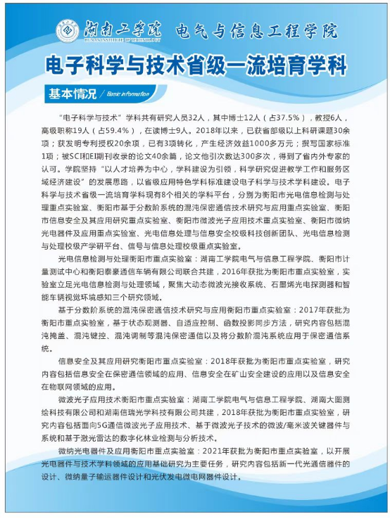 电气与信息工程学院现有8个相关的学科平台,分别为“衡阳市光电信息检测与处理重点实验室”、“衡阳市基于分数阶系统的混沌保密通信技术研究与应用重点实验室”、“衡阳市信息安全及其应用研究重点实验室”、“衡阳市微波光子应用技术重点实验室”、“衡阳市微纳光电器件及应用重点实验室”、光电信息处理与信息安全校级科技创新团队、光电信息检测与处理校级产学研平台、信号与信息处理校级重点实验室。