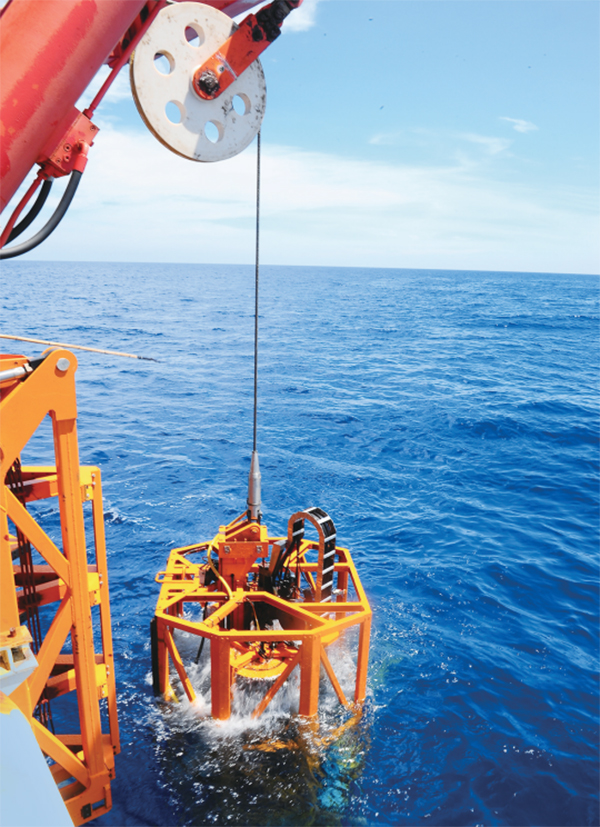 万步炎主持研发的“海牛号”海底多用途钻机系统,首次在超过3000米的深海海底下钻60米,填补了我国海底深孔钻机的空白,也标志着我国成为世界上第4个掌握此项技术的国家。图为“海牛号”完成钻进、取样后顺利出海。 湖南省委宣传部供图 曾志前/摄