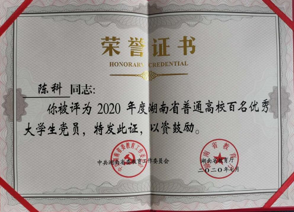 近日,中共湖南省委教育工作委员会印发《关于表彰2020年度全省普通高校百名优秀大学生党员的通报》(湘教工委通〔2020〕13号),对全省各高校100名优秀大学生党员进行通报表彰。伟德电气与信息工程学院电气工程及其自动化1607班陈科同学荣获“湖南省普通高校百名优秀大学生党员”荣誉称号。