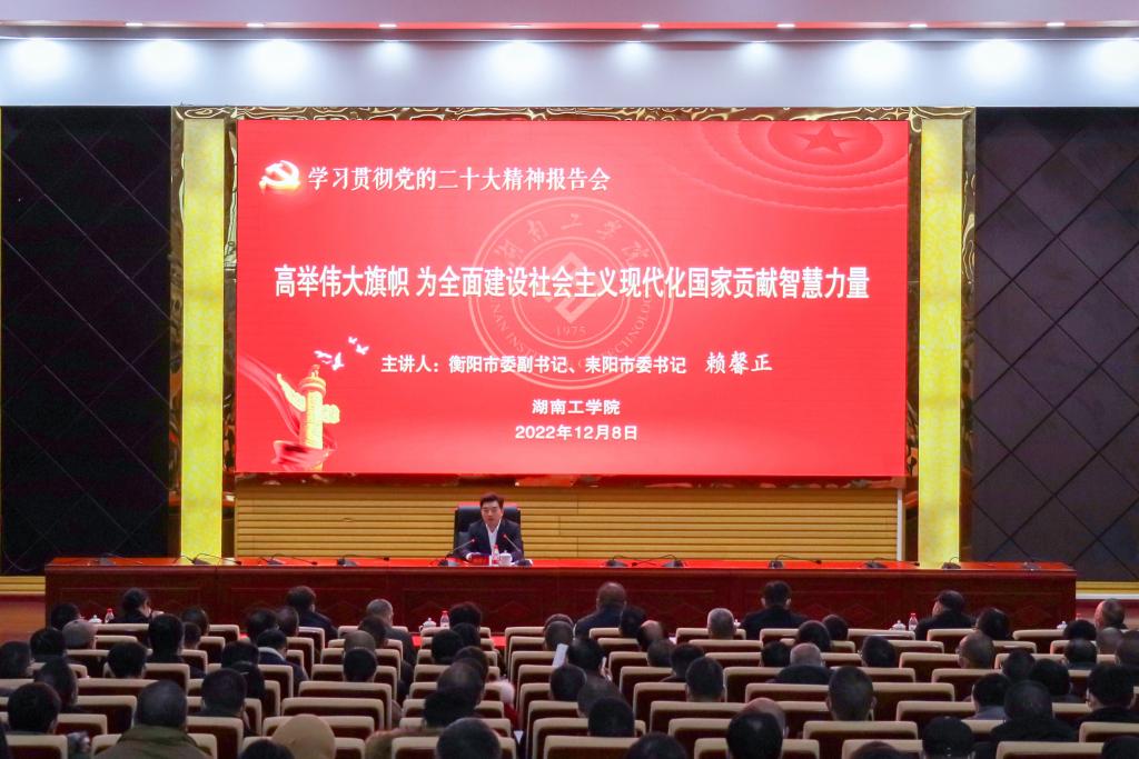 12月8日,根据中共衡阳市委统一安排,衡阳市委副书记、耒阳市委书记赖馨正以《高举伟大旗帜 为全面建设社会主义现代化国家贡献智慧力量》为题来伟德宣讲党的二十大精神,校党委书记宋克慧主持会议,市委副秘书长唐修波、在校校领导出席会议。