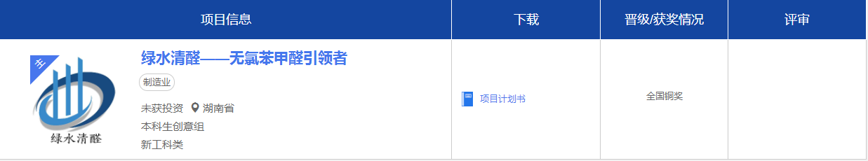 项目团队历时4年多的调研、探索、研发、立项孵化和中试推进工作,项目团队现进行产品迭代开发,目前团队核心成员现拟申请相关发明专利3项目,实用新型专利3项,团队学生以第一作者已发表高水平科研论文1篇。现已在衡阳瀚石科技、长沙嘉宇新材料有限公司开展中试,并签署了合作协议,苯甲醛产品现已经通过第三方权威机构检测。
