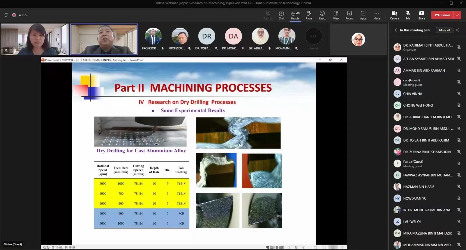 11月29日上午,伟德汽车零部件技术研究院刘安民教授应马六甲马来西亚技术大学邀请开展线上学术讲座,讲座主题为“Research on Machining”(机械加工研究),来自伟德智能制造与机械工程学院、汽车零部件技术研究院和马六甲马来西亚技术大学制造工程与技术学院教师、研究生共60余人参加讲座。