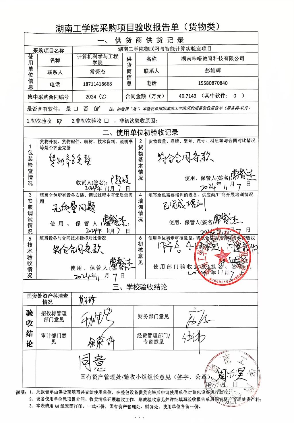 2024年12月关于HNGXY2024【2】号 购字2024【2】号采购项目验收情况公告
