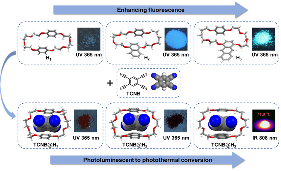 有机固态发光材料因其具有结构可调、成本低廉和加工性能良好等优点,在许多领域都受到广泛的关注。然而,这类体系通常受限于共价键连接的给体-受体型单分子结构,存在合成工艺复杂、缺乏通用设计原则等问题。有机共晶作为一种由两种及以上组分构成的晶态材料,不仅能够通过简便的制备方法实现结构与形貌的精确调控,还可展现出“1+1>2”的协同增强效应。冠醚作为作为第一代超分子大环化合物,其主客体研究受限于溶液体系的稳定性问题。将冠醚与共晶工程相结合,既能够拓展有机共晶体系的组分选择范围,还可以利用大环化合物的自适应性特征,为构建有机固态功能材料提供新思路。