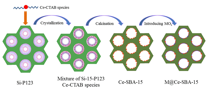通过CTAB-P123双模板剂的策略,将易团聚的Ce物种引入到SBA-15的框架中,可改变载体的表面能,有利于引入M (M=Al, Mg, Zr, Zn)金属氧化物在其表面的分散,所制备的KF/M@Ce-SBA-15的介孔结构比对应的KF/M-SBA-15与KF/Ce-SBA-15有序度高,且产生了超强碱活性位点。利用此种方法可有效解决部分金属氧化物在载体上团聚而影响催化活性的问题。
