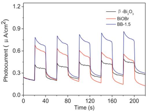 通过形成异质结光催化材料,利用其内电场增加光生电荷的分离效率,增强可见光催化活性.由于独特的结构,Bi2O3是可见光响应光催化剂的潜在候选者,其具有α、β、γ、δ、ε和ω等6种晶型,其中β-Bi2O3具有最高的可见光催化活性,相对低的量子效率限制了其在环境和能源领域方面的应用。发现通过与其他半导体结合形成异质结是一个有效的改善光生电荷分离、提升光催化活性的方法。项目完成人通过蚀刻法在β-Bi2O3表面原位形成异质结,可控制备了系列高性能 β-Bi2O3/BiOX(X=Cl、Br)异质结可见光催化材料,利用异质结内电场增加了光生电荷的分离效率,瞬时光电流实验可证实光生电荷分离机迁移的能力,异质结光催化剂β-Bi2O3/BiOBr的光生电荷的分离效率优于β-Bi2O3和BiOBr。