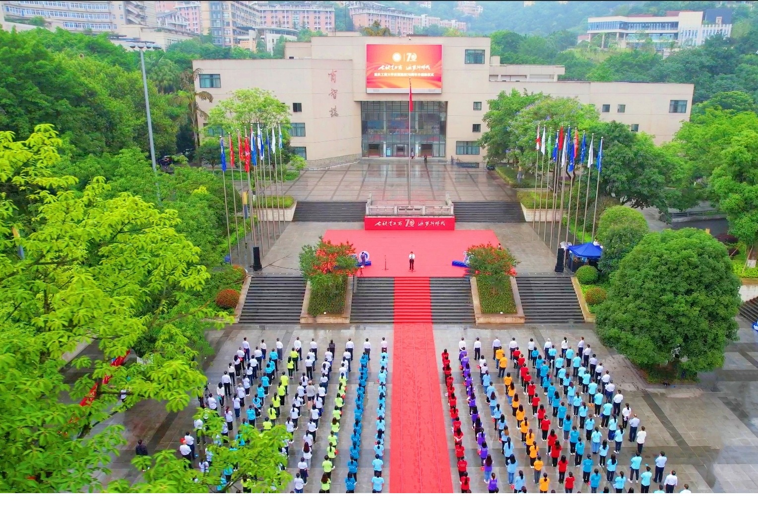 6月6日上午,我校隆重举行庆祝建校70周年升国旗仪式。全体校领导、党委常委、中层干部代表、教职工代表、离退休教职工代表、学生代表、校友代表共计700人齐聚含弘广场,在五星红旗下为学校庆生。升旗仪式由学校党委副书记宋豫主持。7时07分,升旗仪式正式开始。学校国旗护卫队队员昂首挺胸,脚步坚定铿锵,护卫着五星红旗走向升旗台。在雄壮的国歌声中,五星红旗冉冉升起,全体师生向国旗行注目礼,齐唱中华人民共和国国歌,深...
