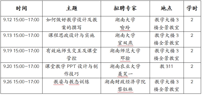根据湖南省教育厅《关于做好2024年全省普通高校教师岗前培训及考试(考核)工作的通知》(湘教通[2024]140号),为切实提高新入职教师教育教学水平,加快建设高素质专业化创新型高校教师队伍,教师发展中心将于2024年9月份举办教师教学基本功系列培训,现将有关事项通知如下: