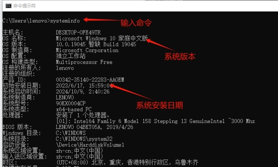 2. 操作系统安装时间:输入cmd运行命令界面,输入命令systeminfo,如图;