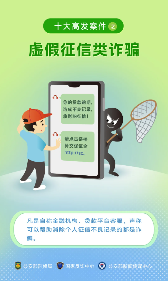 诈骗分子通过冒充银行、金融机构客服人员,谎称受害人之前开通过微信、支付宝、京东等平台的百万保障、金条、白条等服务,或申请校园贷、助学贷等账号未及时注销,或信用卡、花呗、借呗等信用支付类工具存在不良记录,需要注销相关服务、账号或消除相关记录,否则会严重影响个人征信。随后,诈骗分子以消除不良征信记录、验证流水等为由,诱导受害人在网络贷款平台或互联网金融 APP 进行贷款,并转到其指定的账户,从而骗取钱财。