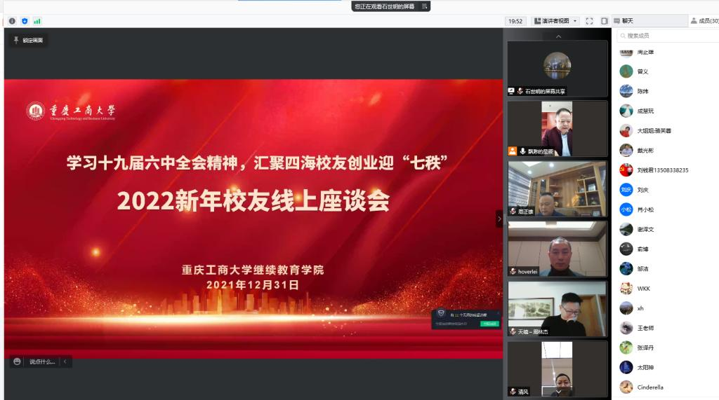 为进一步向校友宣传党的十九届六中全会精神,共同庆祝元旦新年,以崭新的姿态迎接我校70周年校庆,继续教育学院于12月31日举行了主题为“学习十九届六中全会精神,汇聚四海校友创业迎七秩”2022新年校友线上座谈会。继续教育学院党总支书记石世明、院长杜朝辉、学院教职工和全国各地校友代表参加了本次座谈会,活动由继续教育学院校友分会秘书长陈之举主持。