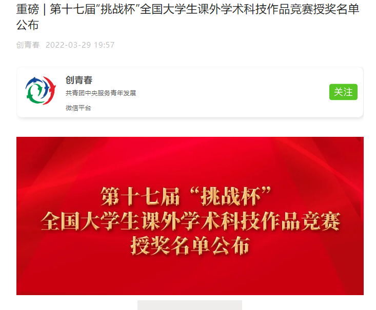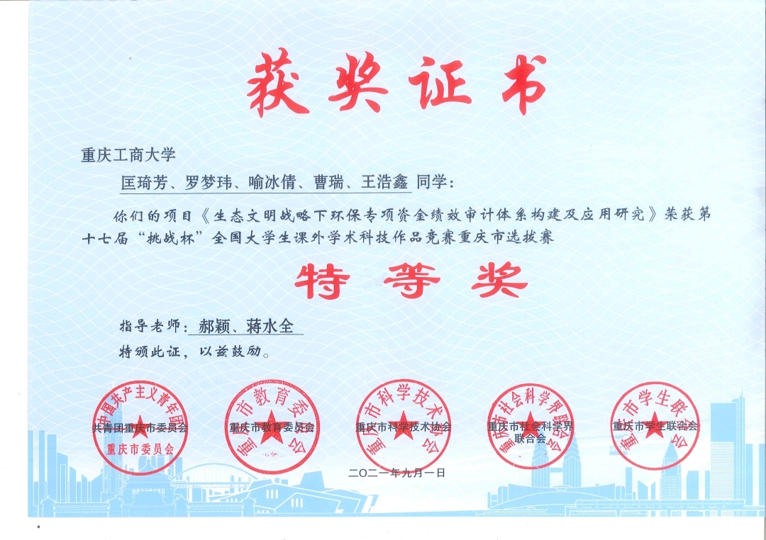 3月29日,第十七届“挑战杯”全国大学生课外学术科技作品竞赛授奖名单公布,JINNIAN金年会会计学院本科生匡琦芳、罗梦玮、喻冰倩、曹瑞、王浩鑫(指导老师:郝颖 蒋水全)组成的团队(参赛题目:生态文明战略下环保专项资金绩效审计体系构建及应用研究)荣获全国三等奖(重庆赛区特等奖)。