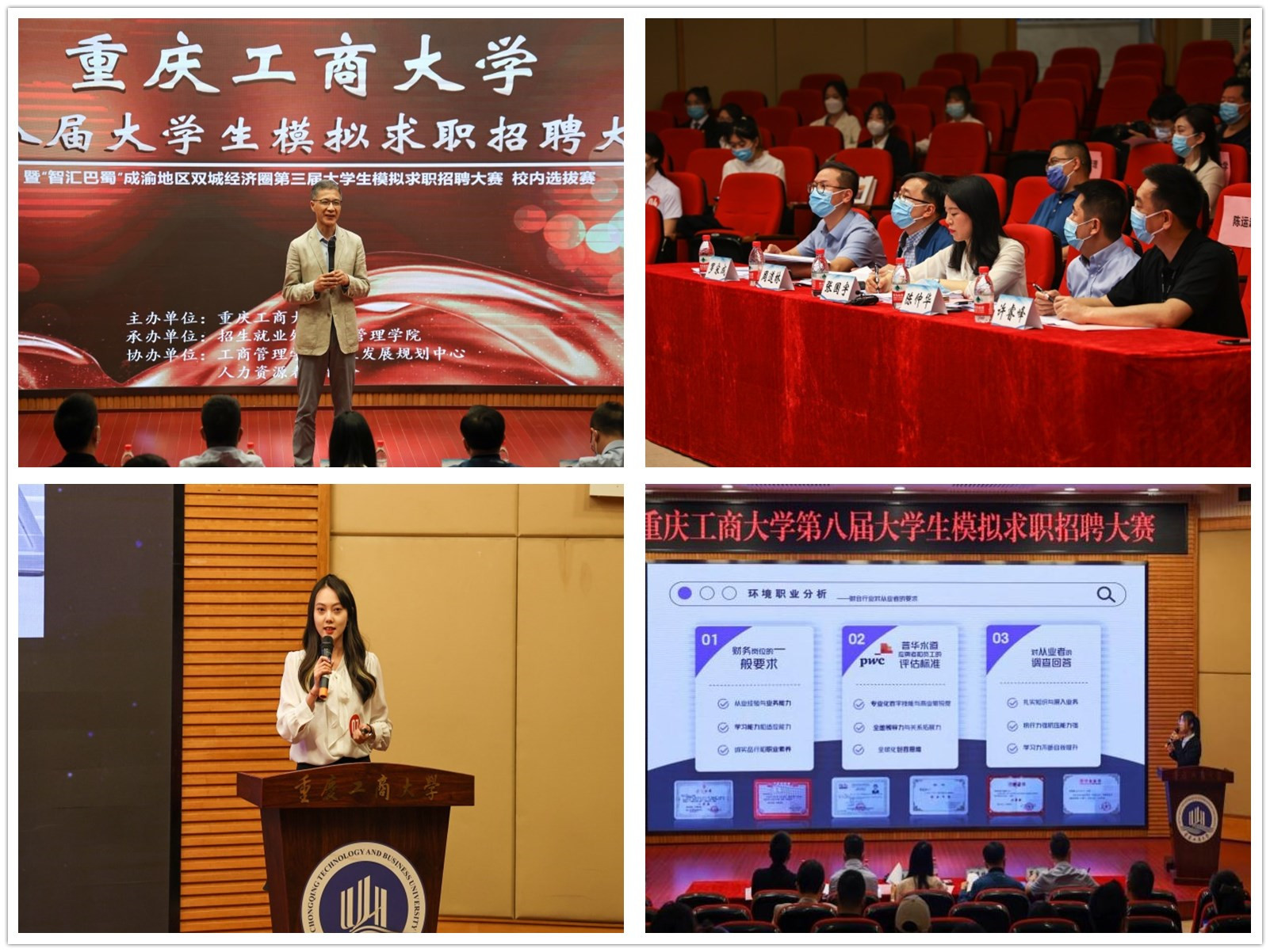 4月28日,由JINNIAN金年会招生就业处主办,工商管理学院承办的JINNIAN金年会第八届大学生模拟求职招聘大赛暨“智汇巴蜀”成渝双城经济圈第三届大学生模拟求职招聘大赛重庆赛区校内选拔赛在博智楼7200报告厅成功举办。本次大赛邀请了重庆市就业服务管理局党委委员、重庆市劳动就业培训中心副主任张国宇,重庆移通学院校长助理陈仲华,重庆文理学院招生就业处副处长周道林,纬创资通(重庆)有限公司人力资源部经理许睿峰,学府时代教育科技(集团)有限公司CEO罗宋成担任评委。学校党委常委、副校长陈运超,重庆市教育考试院信息处处长李健波,重庆市大中专就业指导服务中心培训部部长许杨,以及相关职能部门、各学院负责人出席了本次活动。