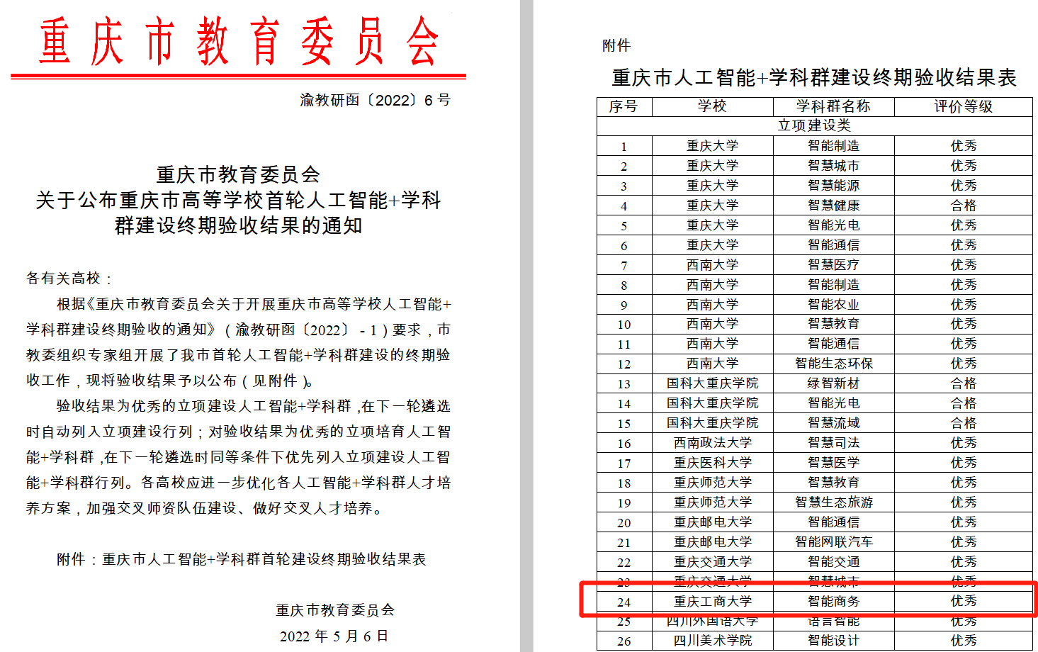 2022年5月6日,重庆市教育委员会公布了重庆市高等学校首轮人工智能+学科群建设终期验收结果,我校牵头建设的“智能商务”学科群验收结果荣获优秀,这表明我校“智能商务”学科群将在下一轮遴选时,自动进入立项建设行列。