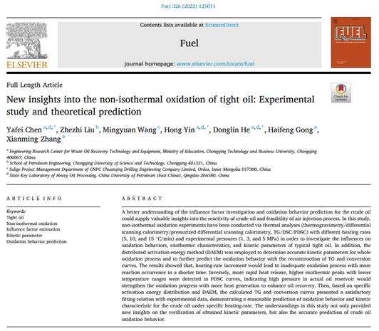 近日,我校废油资源化技术与装备教育部工程研究中心陈亚飞博士在油类非等温热处理过程中实验参数的影响及氧化行为理论预测方面取得最新研究进展,在能源领域顶级期刊《Fuel》上发表了题为“New insights into the non-isothermal oxidation of tight oil: Experimental study and theoretical prediction”的研究论文(https://doi.org/10.1016/j.fuel.2022.125011)。