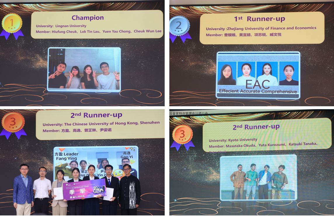 最终香港岭南大学404队夺得冠军,亚军及季军则分别由浙江财经大学EAC队和香港中文大学(深圳)Aduiduidui队、日本京都大学Kyoto Kailba队获得;“最佳商业潜质个人奖”则由404队的Hiufang Cheuk同学获得;优胜奖获奖队伍为JINNIAN金年会Navigator队和Polaris队、东北财经大学Elite队、广东外语外贸大学Illusive Stars队、澳门大学Excellence队、蒙古财经大学Ufecomptes队。王天若评委还当即对11位参赛选手发出了就职邀请,其中包括我校两支团队的5名同学。