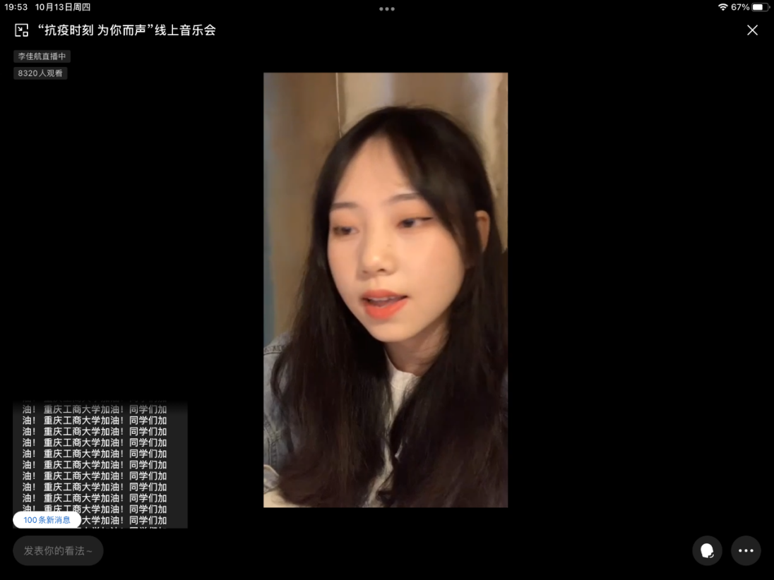 10月13日晚19:30,校团委通过企业微信用线上直播的方式举办“战疫时刻,为你而声”线上音乐会。音乐会通过线上演唱与游戏环节相结合的形式,10余名同学用音乐表达对终将战胜疫情的信心,用歌声把温暖和力量传递给全校师生。这是一场特殊的演唱会,同学们在线上隔空聚首,互相鼓励打气,评论区“JINNIAN金年会加油!同学们加油!”的弹幕文字刷满屏幕,凝聚着大家抗击疫情的坚强信念。本次线上音乐会受到全校师生热烈关注,直播预约人数近9000人,线上观看1.8万余人次,互动留言5.7万余条。