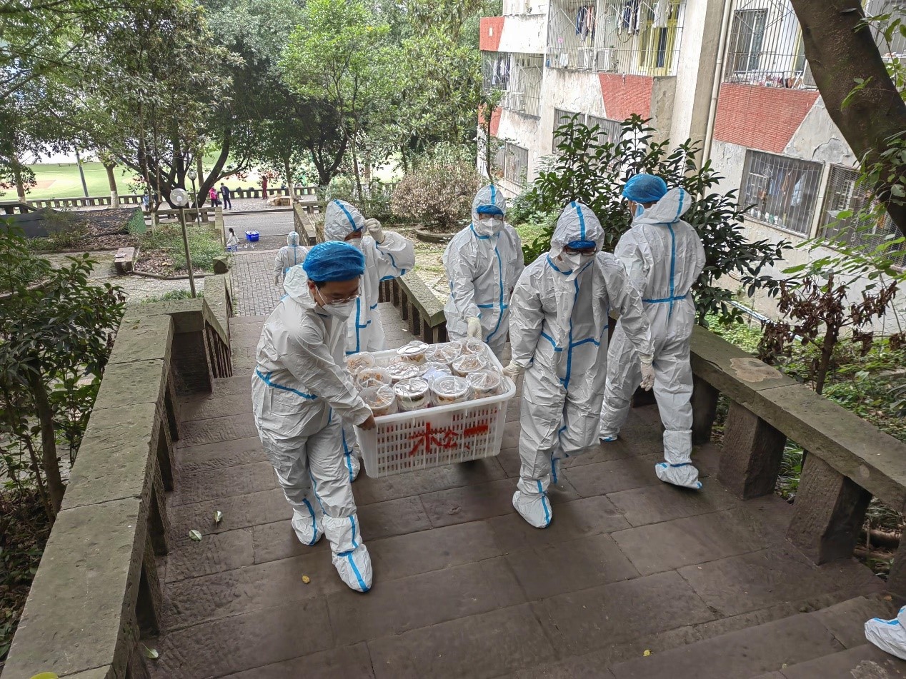 “同学,谢谢你配合学校疫情防控工作,吃饭了!”为了让隔离在寝室的同学们及时吃上饭、吃饱饭,相关学院迅速组织教职工志愿者为同学们提供送餐等服务。