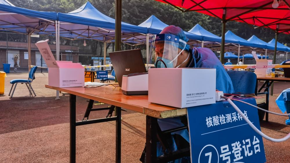 曾晓松在做核酸采样信息录入工作、为学生提供送餐志愿服务
