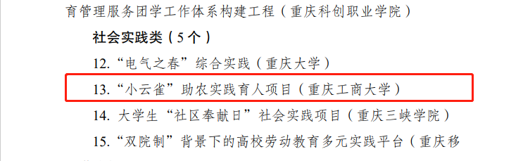 近日,共青团重庆市委、重庆市学生联合会发布了关于2022年重庆市高校“一校一品”十佳(优秀)团学工作品牌的通报,我校管理科学与工程学院社会实践类项目 《“小云雀”助农实践育人项目》、机械工程学院创新创业类项目 《“工于技、匠于心、品于行——学生科技创新项目》荣获优秀团学工作品牌奖。