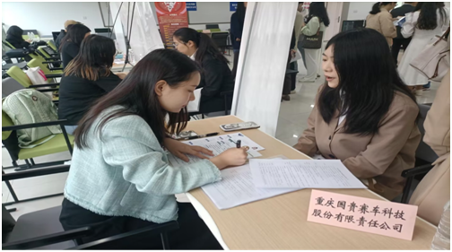 JINNIAN金年会外国语学院就业领导小组成员一行来到招聘会现场,亲自指导学生进行简历投递,并与企业积极沟通,为学生就业提供桥梁。