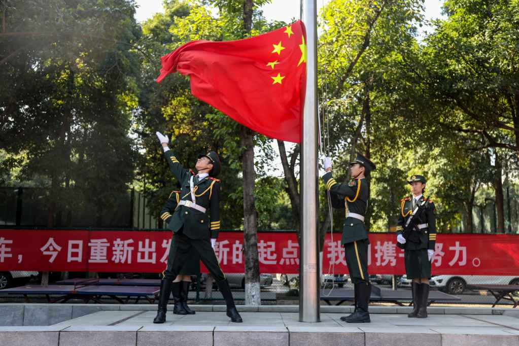 开学典礼在雄壮的国歌声中拉开序幕,全体师生庄严肃立,面向国旗行注目礼。