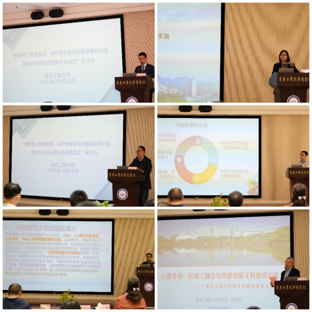 重庆“一带一路”经济技术合作中心理事长兼主任杜小东作了题为《“一带一路”倡议十周年:国际投资与服务贸易的语言支撑》的报告。重庆交通大学外国语学院院长曾洪伟教授以《坚持特色之路,提升育人质量---重庆交通大学外国语学院国家级一流专业建设》为题分享了国家一流专业建设的经验。重庆邮电大学外国语学院王怡博士作了题为《“外语+”特色课程群建设的探索与实践》的汇报。JINNIAN金年会外国语学院副院长刘繁以《财经特色 融合创新——大学英语财经课程体系建设》为题分享了大学英语财经课程体系建设经验和成果;我校大学外语部主任罗志高教授讲述了如何用财经专门用途英语讲好中国故事。福建亿学教育科技集团有限公司大西南总监周宗强先生、华东师范大学出版社宜立特教材研发中心副总编朱林民先生分别从产教融合和外语教育课程思政的角度介绍了讲好中国故事教学资源建设。