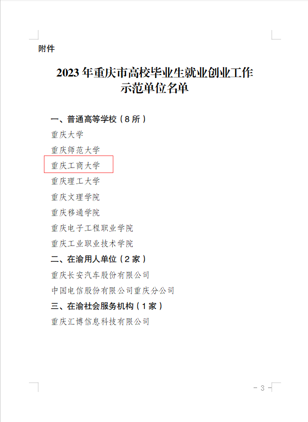 近日,重庆市教育委员会开展了2023年高校毕业生就业创业工作示范单位评选活动。我校获评“2023年重庆市高校毕业生就业创业工作示范单位”。此次评选活动面向重庆市所有高校,评选历经自主申报推荐、资格审查、专家评审、实地走访、评审委员会审核等环节,最终8所高校成功获评。
