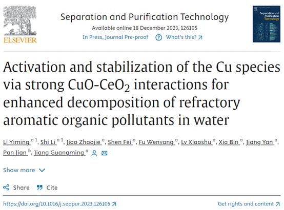 近日,我校废油资源化技术与装备教育部工程研究中心硕士研究生李熠明和石力,在导师焦昭杰和蒋光明研究员的联合指导下,在关于含油废水中难降解有机物去除方面取得了重要进展,在国际学术期刊《Separation and Purification Technology》发表了题为“Activation and stabilization of the Cu species via strong CuO-CeO2interactions for enhanced decomposition of refractory aromatic organic pollutants in water”(CuO-CeO2强相互作用活化和稳定的Cu产物对水中难分解芳香族有机污染物的强化降解)的学术论文(https://doi.org/10.1016/j.seppur.2023.126105),标志着废油中心在含油废水净化处理领域的研究取得了新进展。